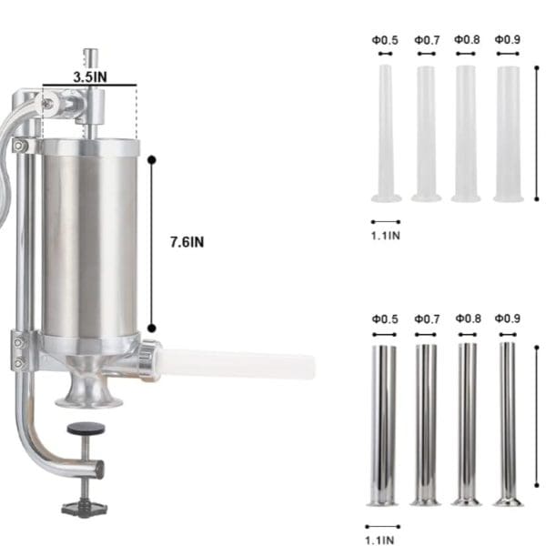 - Sausage stuffer comes with 4 stainless steel tubes and free bonus 4 plastic tubes. And the diameters are 14mm, 18mm, 21mm and 25mm, which will allow you can make fresh and different size sausages easily at home.