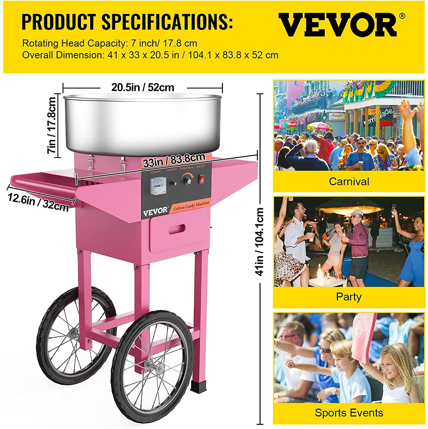 - ASSURING QUALITY?- Commercial cotton candy machine, with 1000W max heating power, 30W operating power. 21″ food-grade stainless steel bowl. Aluminum sugar outlet for even heating.