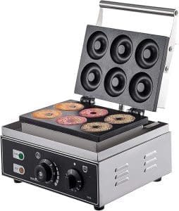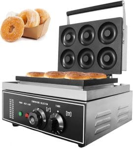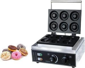 - The automatic Doughnut maker adopts dual pans (upper and lower), providing even heating. They form up delicious donuts (6 donuts per time). With donut diameter of 3″, and donut thickness of 0.6″.