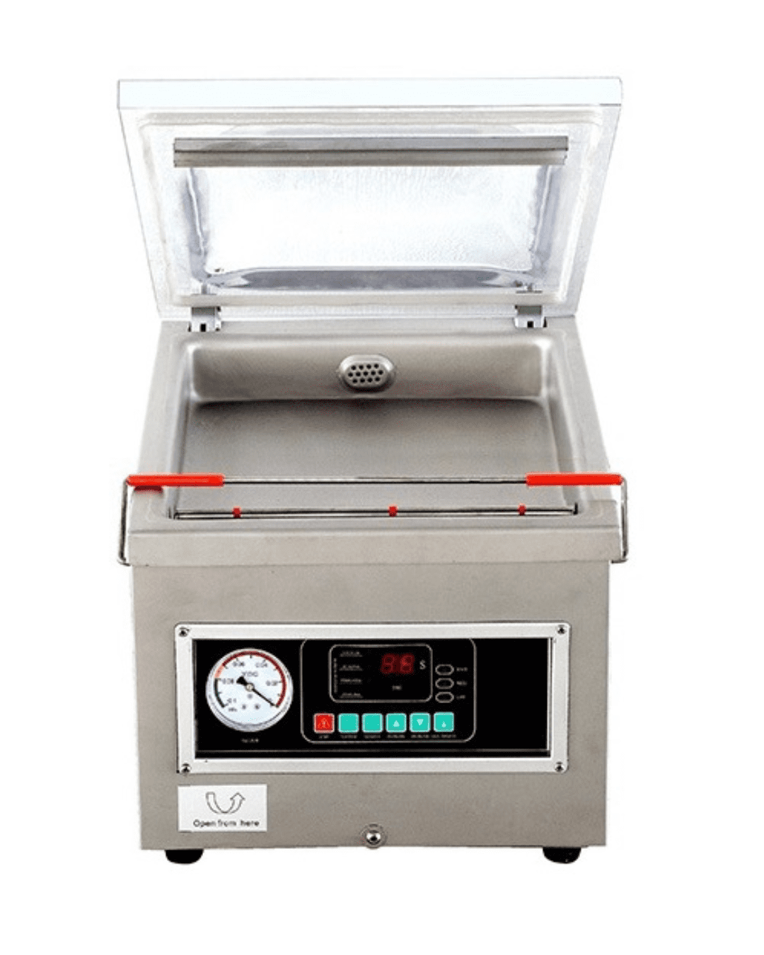 | Control Panel / Interface | Micro-computer control: vacuum time, sealing time, cooling time are adjustable. Has a red emergency stop switch. |