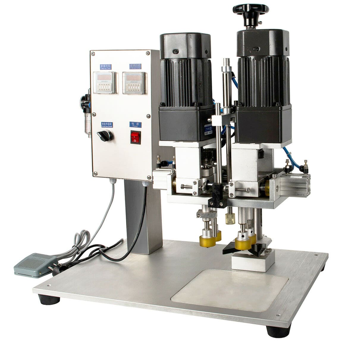 This is a semi-automatic pneumatic capping machine designed for duckbill caps and spray head caps.Such as plastic screw caps, pump caps, spray gun caps, duckbill caps, etc. Widely used in food, daily chemical and other industries